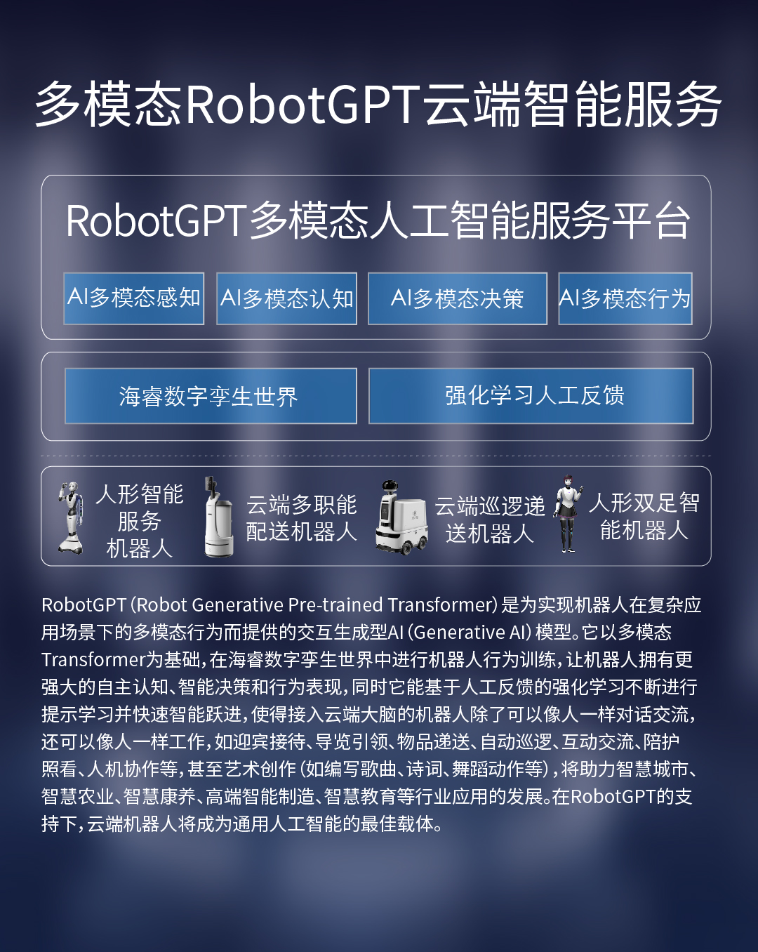 生成型AI(Generative AI)模型。它以多模态Transformer为基础,在海睿数字孪生世界中进行机器人行为训练,让机器人拥